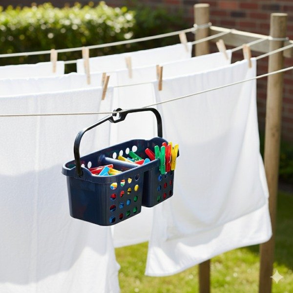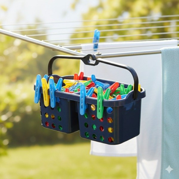 Asa con Gancho: El mango tiene una curvatura en el centro diseñada para colgarse directamente de la soga o el tendedero. Esto permite deslizar la canasta a medida que vas avanzando por la cuerda sin tener que agacharte.