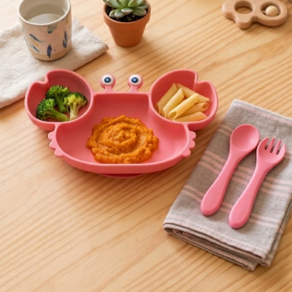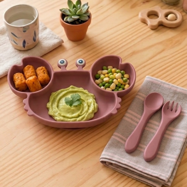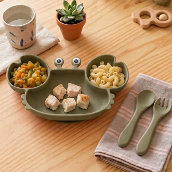 Set alimentación x3 incluye: plato cangrejito divisiones + tenedor + cuchara