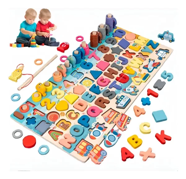 Incluye un tablero con clavijas numéricas y un juguete de pesca con peces y caña.
