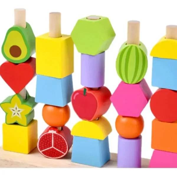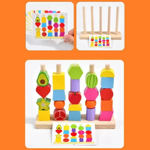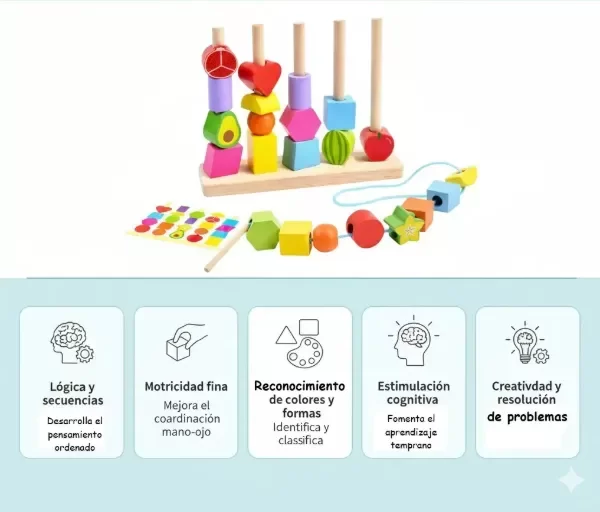 Multi-Juego Versátil: Apila en 4 postes, encastra figuras (corazón, estrella, hexágono etc.), enhebra con cuerda + lápiz.