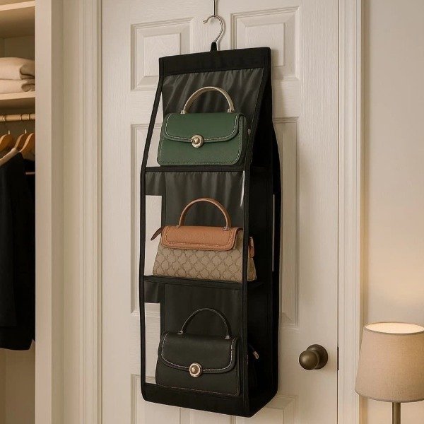 Una solución perfecta para guardar carteras de forma organizada adentro del placard. hecho de tela de poliester y PVC transparente con gancho metálico.