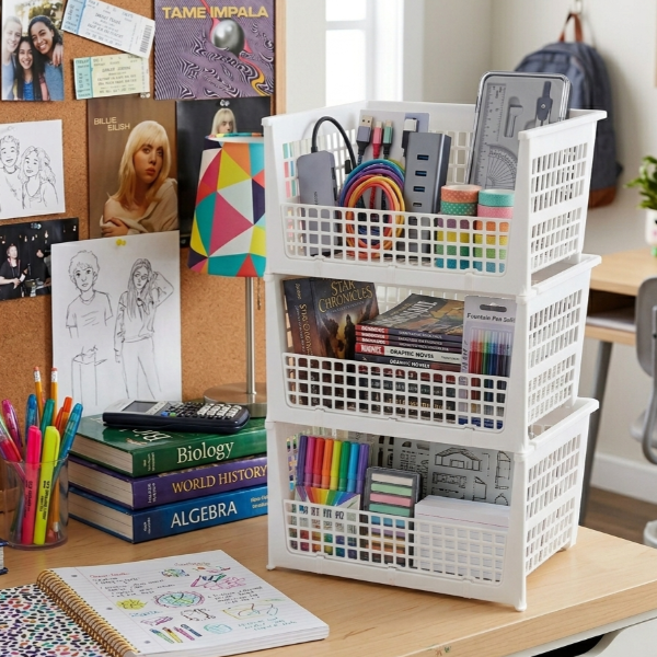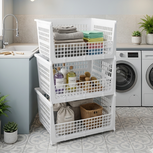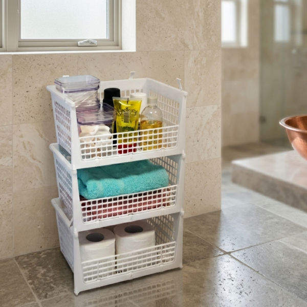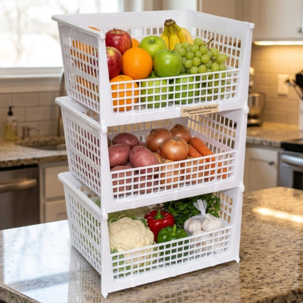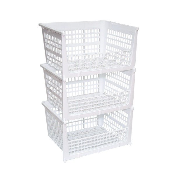 Kit de 3 cestos calados apilables.