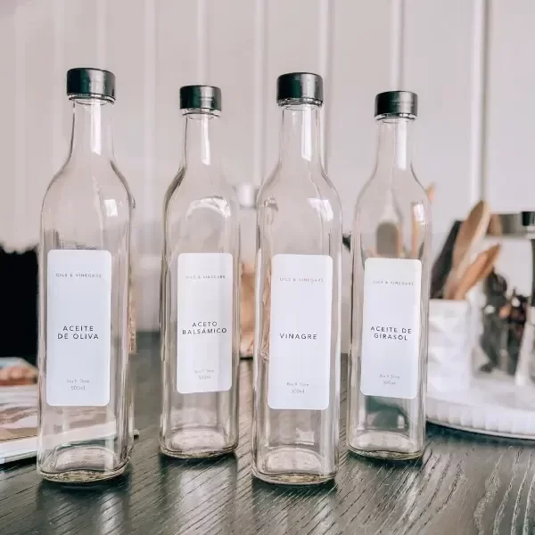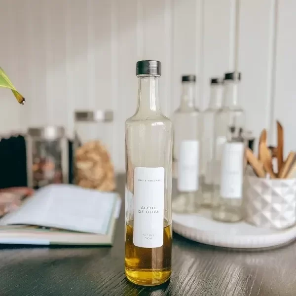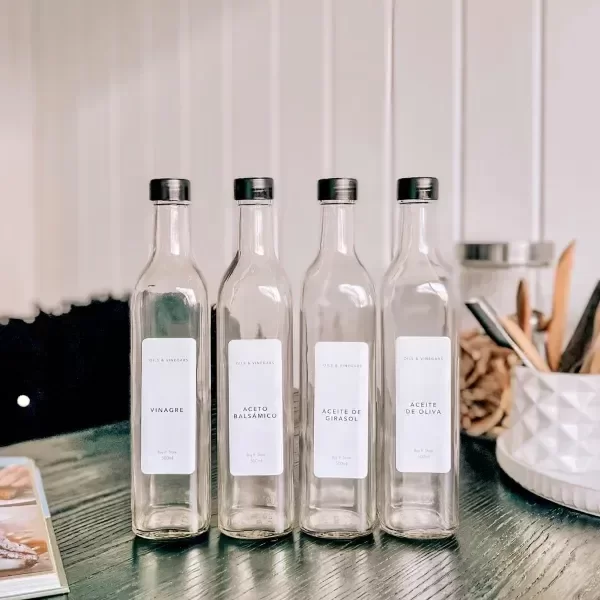 Botella de vidrio con pico vertedor y tapa rosca, etiqueta vinilica a prueba de agua y humedad.